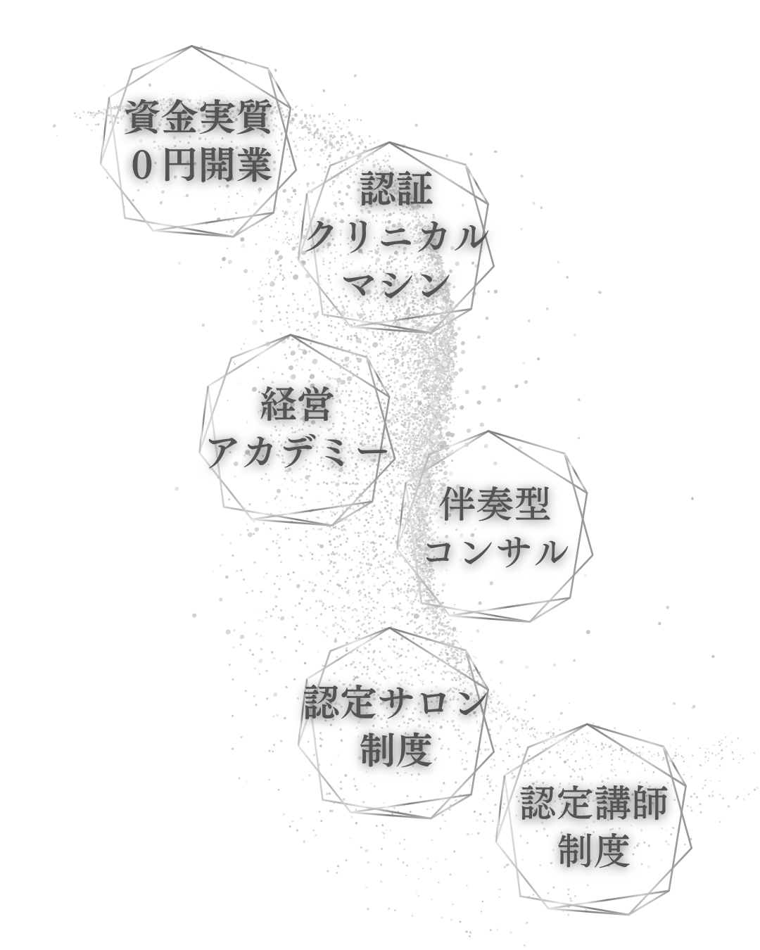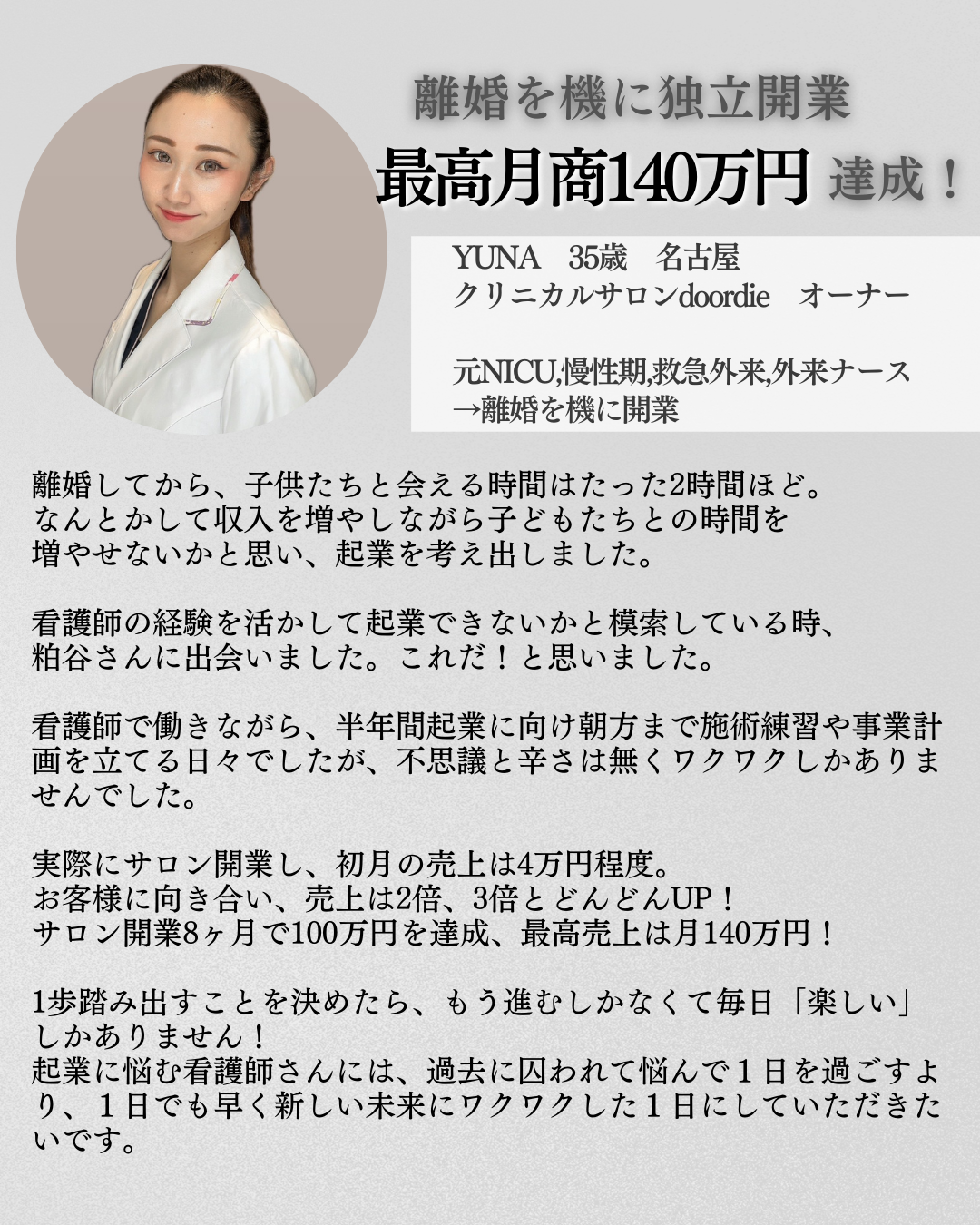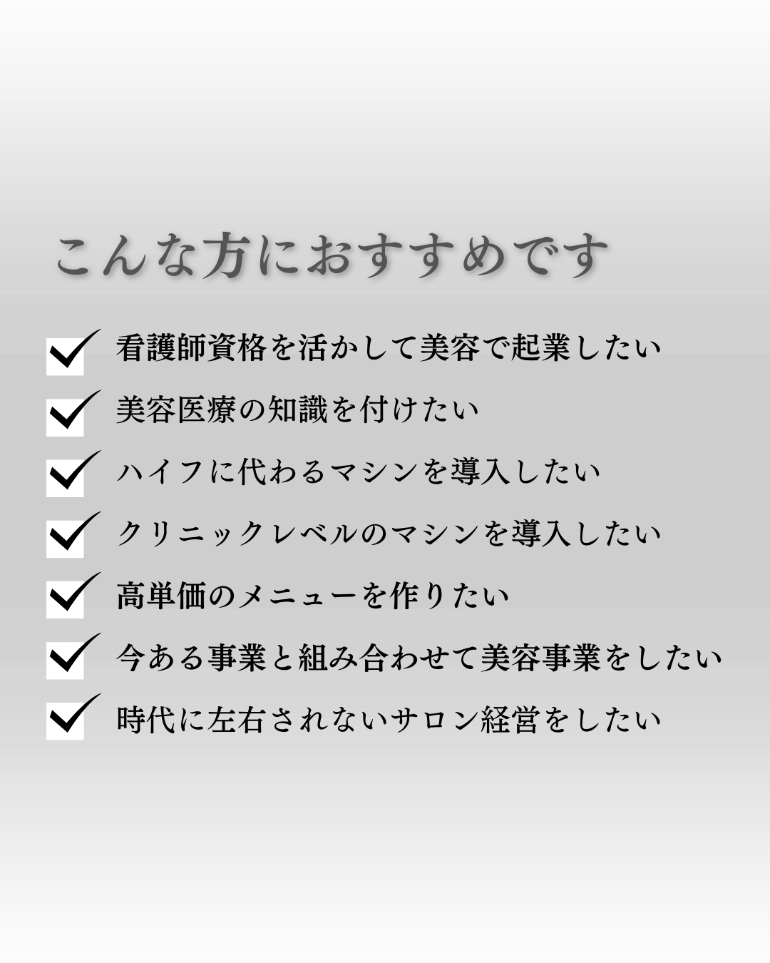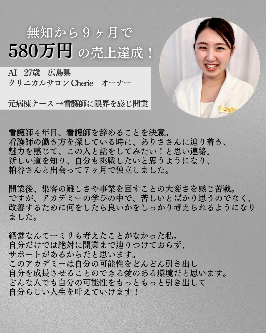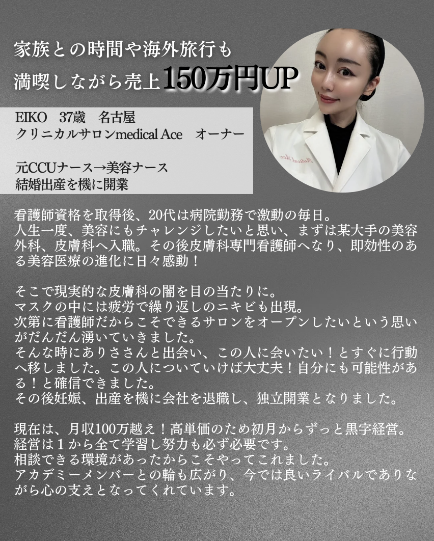 看護師の安心と信頼をブランドに掲げ、美容クリニックよりも敷居が低いながらも、結果にコミットするお店を作る。最高月商980万円を達成。マシンのメーカー業も展開し、マシン販売実績は50サロンを突破。